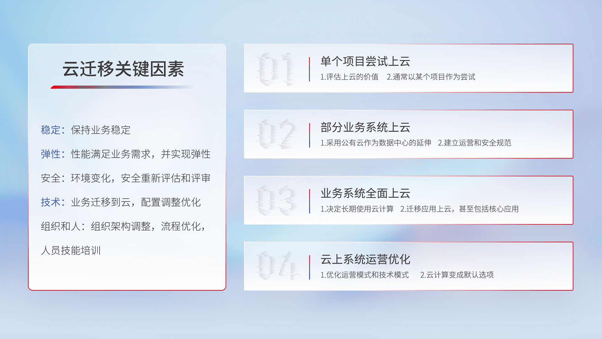 结合实际业务,,从规划设计、、云平台选型、、云原生改造、、、、数据迁移、、集成交付,,,迁移全过程为客户识别最佳上云路径,,做好风险识别管理,,,设计网络架构、、身份权限、、、安全审计合规、、、操作审计、、日志审计、、监控告警策略、、、多站点容灾设计等,,对云上基础设施进行整体规划,,提升IT治理水平,,,以满足弹性、、高可用、、、、高性能的需求。。