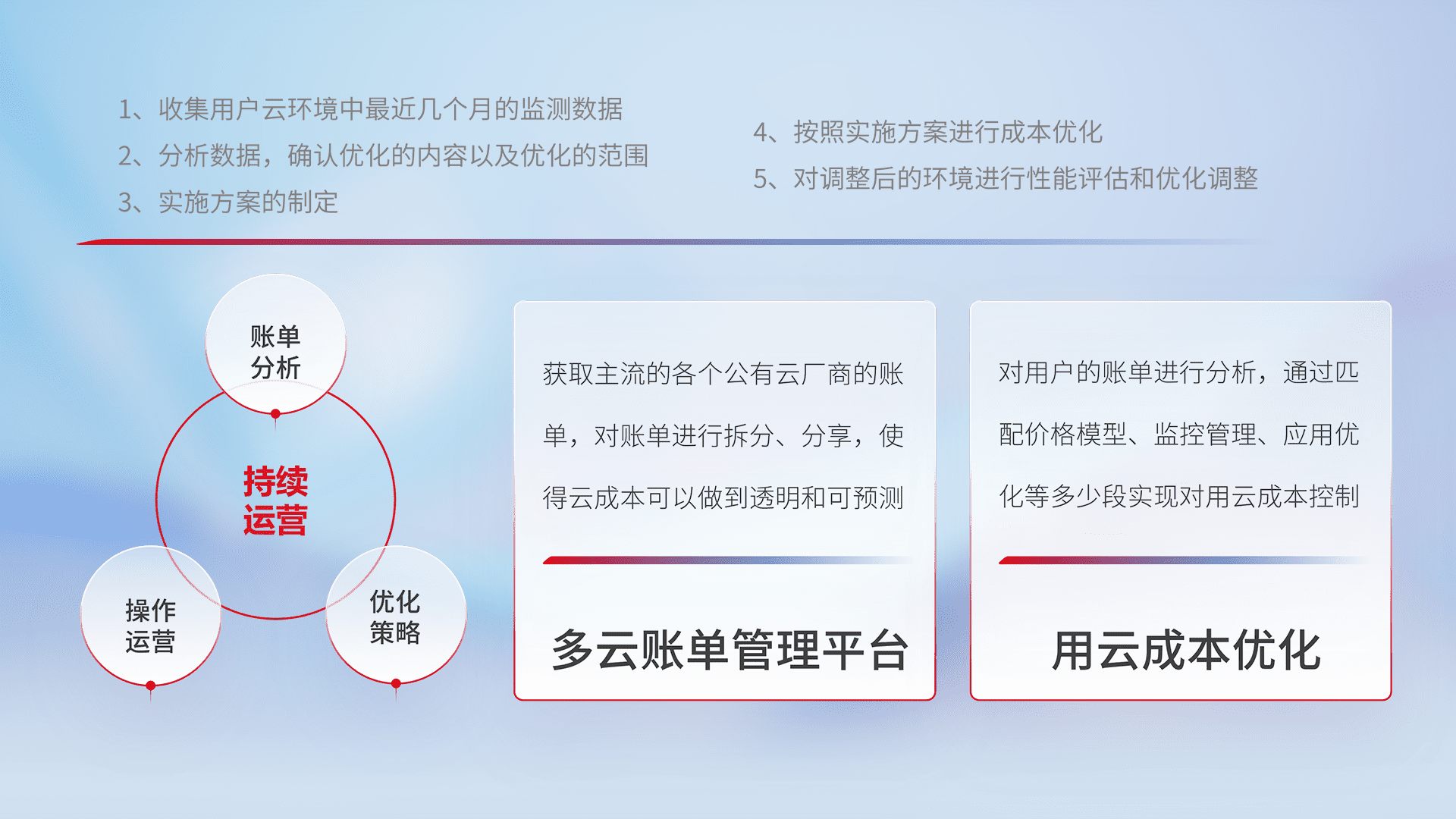 通过多云纳管,,,以统一的资源数据模型把客户的云资源进行抽象和封装,,进而实现对多云资源的统一操作,,,,保障云资源管理的可靠性、、稳定性与可用性。。量身定制化运维内容,,配置、、开发运维、、、补丁管理、、备份、、、监控、、、、认证和访问管理、、、、审计和日常巡检等,,,保障在用云过程中的可靠度,,稳定度以及高可用率。。。。